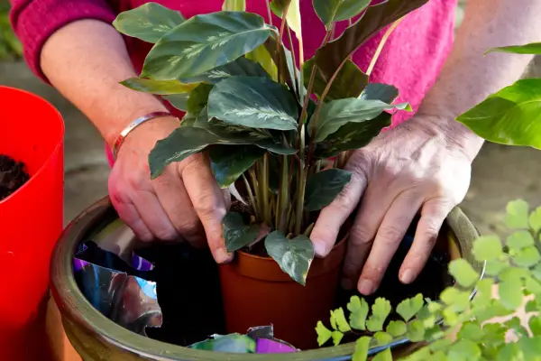 Cómo cultivar calathea - planting a calathea in a container with other shade-loving plantas domésticas