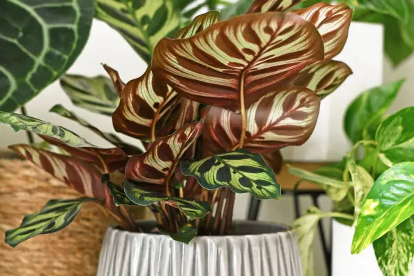 Calatheas son hermosas plantas domésticas cultivado por su impresionante follaje. Los lados superiores de las hojas parecen haber sido pintados con hermosas pinceladas, a menudo están intrincadamente estampadas, en muchos tonos de verde. La parte inferior de las hojas a menudo es de color rojo burdeos.