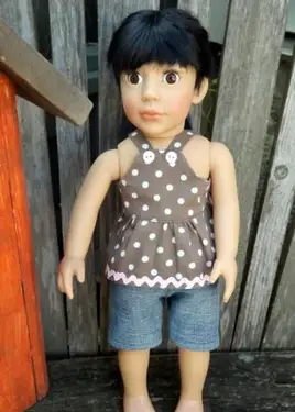 Los patrones de este atuendo se ajustarán a una muñeca American Girl, pero se pueden modificar fácilmente para una muñeca de 21 '. Agregue una pulgada o dos a la longitud de la parte de la falda en la parte superior del sol. Esto proporcionará la cobertura necesaria sobre la sección media. Los pantalones cortos de jean se pueden dejar como están, pero serán mucho más cortos en una muñeca de 21 '. Agregue una pulgada o dos a la longitud si prefiere que el dobladillo esté a la altura de la rodilla.